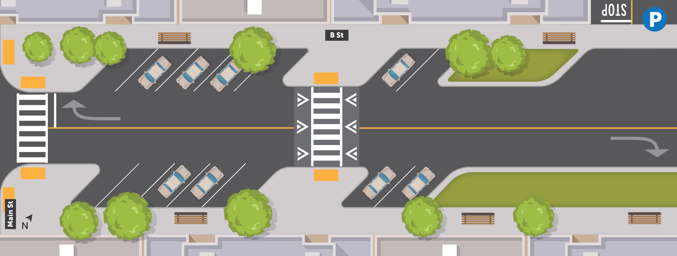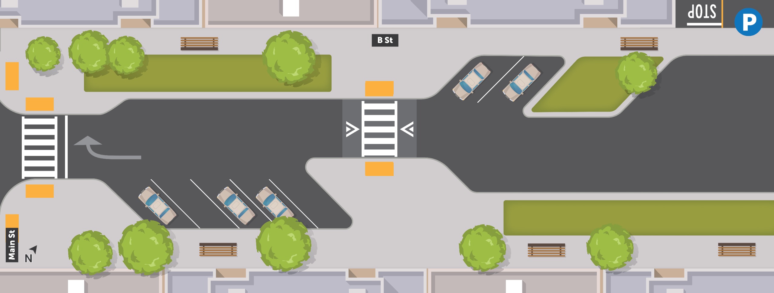 For this corridor, the City is presenting three design options, each offering a different way to experience B Street. We heard in the design charrette a desire to prioritize B Street for pedestrian access to local businesses. All three of the options below are designed to reduce vehicle speeds and through vehicle travel, while retaining local access to businesses and parking. Help identify which option you think best achieves these goals.